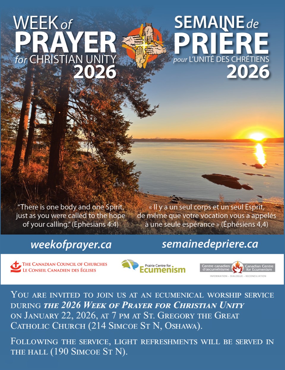 | In-Person: Week of Prayer for Christian Unity Prayer Service 2026 January 18, 2025, 4:00 p.m. EST Runnymede United Church Toronto ON Poster for the event can be found here. To view photo click here. |