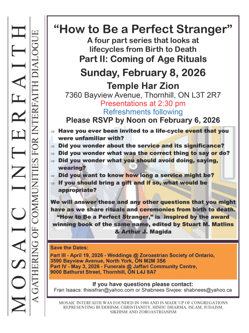 | In-Person: Mosaic Interfaith: How to Be a Perfect Stranger Part 2: Coming of Age Rituals February 8, 2026, 12:30 p.m. EST Temple Har Zion Thornhill, ON RSVP required. To register click here. To view poster click here. |