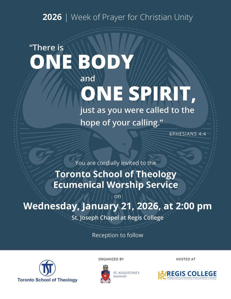 | In-Person: Toronto School of Theology Ecumenical Worship Service January 21, 2025. 2:00 p.m. EST St. Joseph Chapel at Regis College Toronto, ON Reception to follow For more information, visit bit.ly/3Yg7zX2. To view poster, click here. |